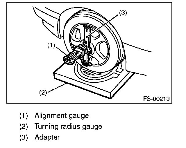 1) Place the front wheel on the turning radius gauge. Make sure the ground contact surfaces of the front and rear wheels are at the same height.