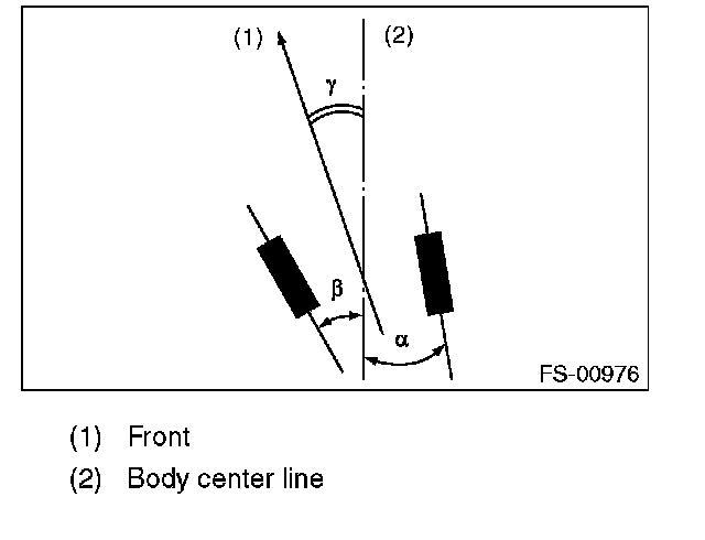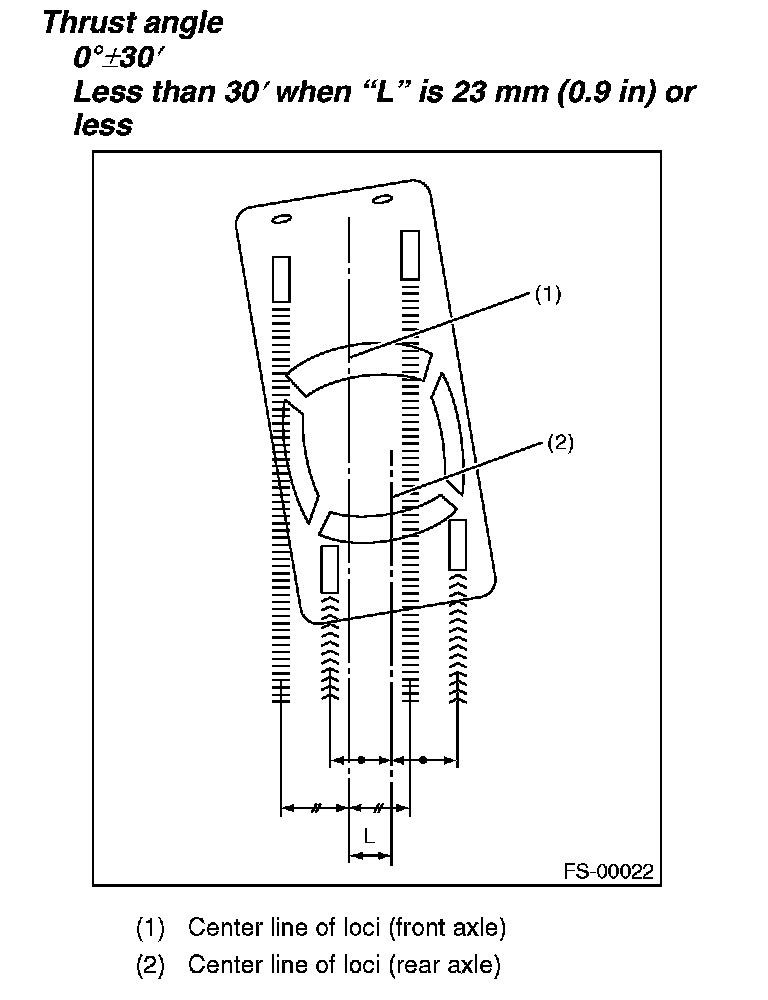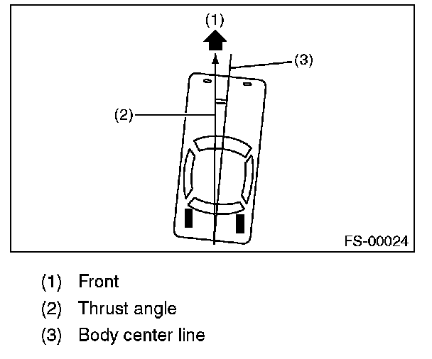 Thrust angle is a mean value of left and right wheel toe angles in relation to the vehicle body center line. Vehicle is driven straight in the thrust angle direction while slanting in the oblique direction depending on the degree of the mean thrust angle.