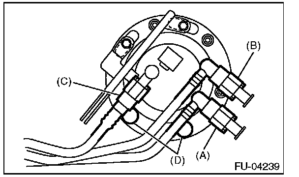 7. Disconnect the quick connectors of fuel delivery tube (A), fuel return tube (B), and jet pump tube (C).