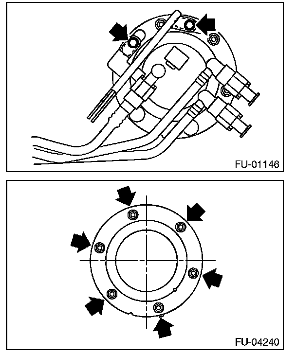 9. Remove the bolts and nuts which hold fuel sub level sensor protector and fuel sub level sensor upper plate to the fuel tank.