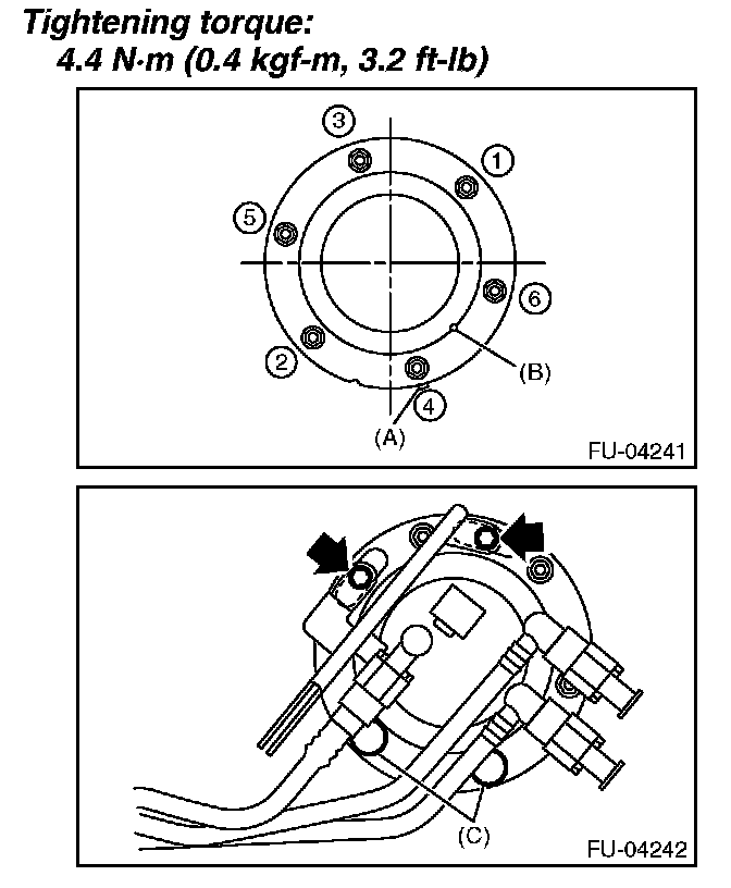 - Align protrusion (B) of the fuel sub level sensor to the cutout in the fuel sub level sensor upper plate.