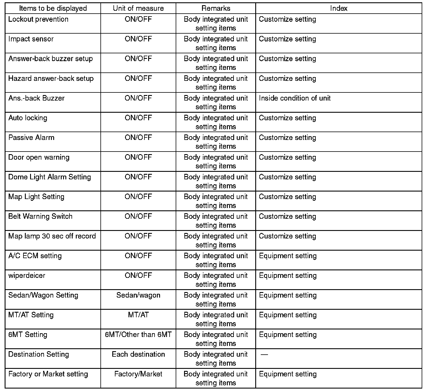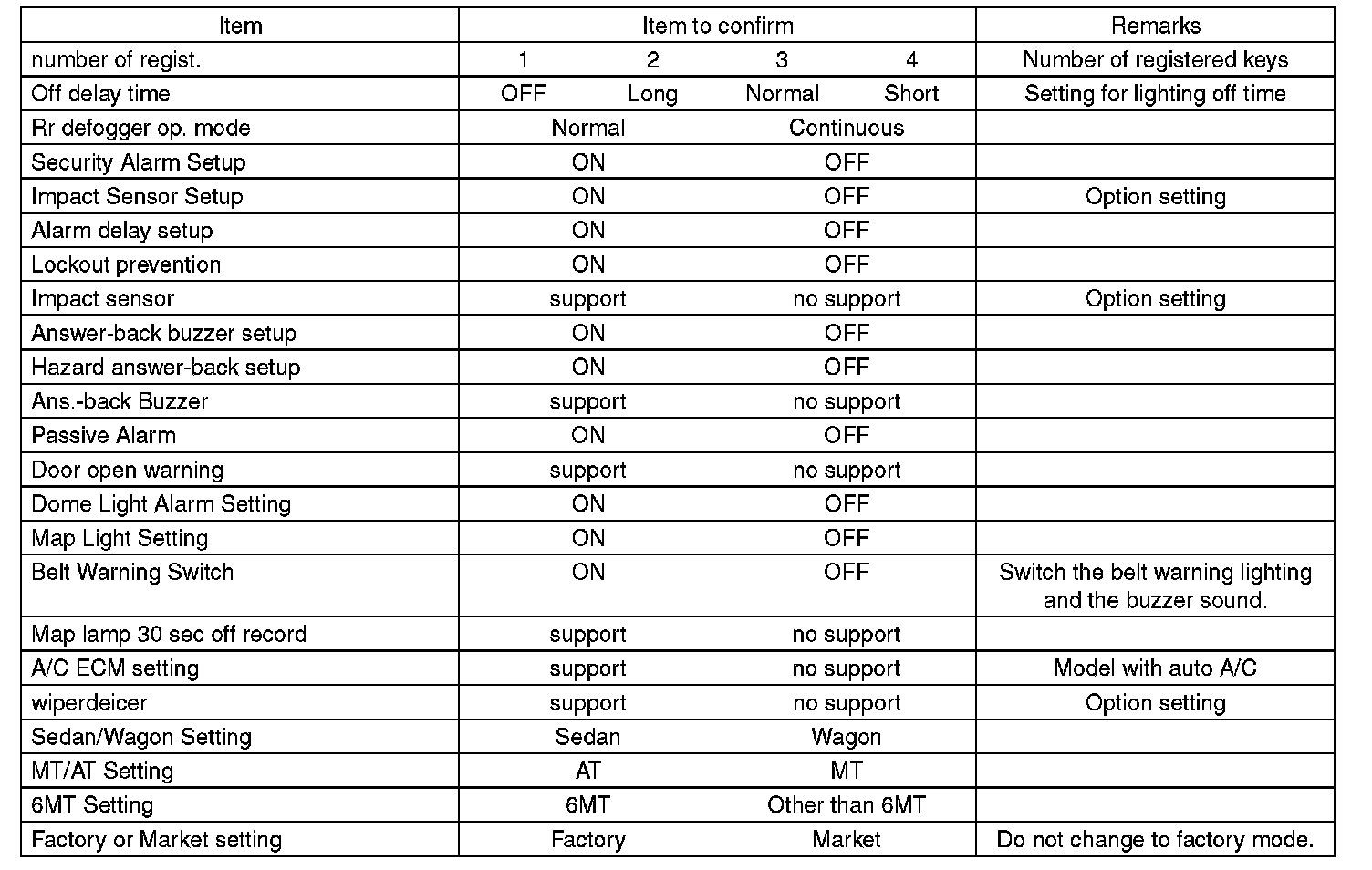 - Confirm key illumination does not blink or "Factory or Market setting" of body integrated unit registrations is "Market". If "Factory or Market setting" is set to "Factory," key illumination blinks when ignition key is turned ON, to notify that the settings are unconfirmed.