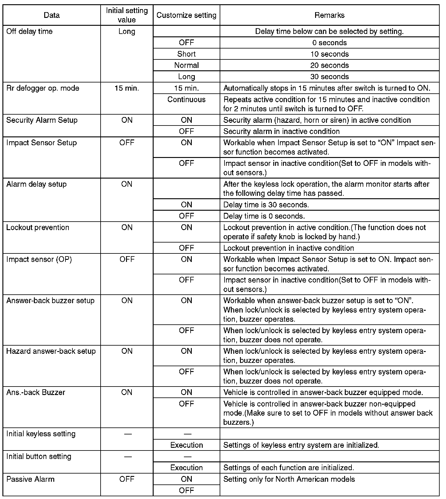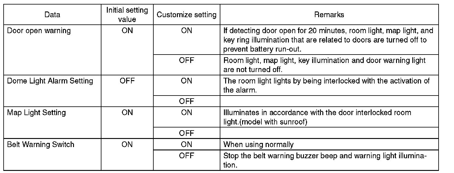 - Each settings have been set. It can be recognized by key ring illumination coming on in concocting with room light and going off with ignition switch turned to ON.