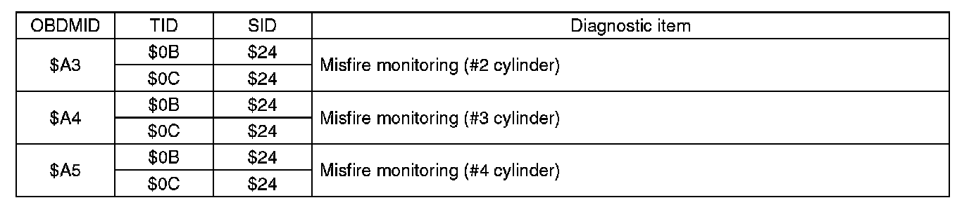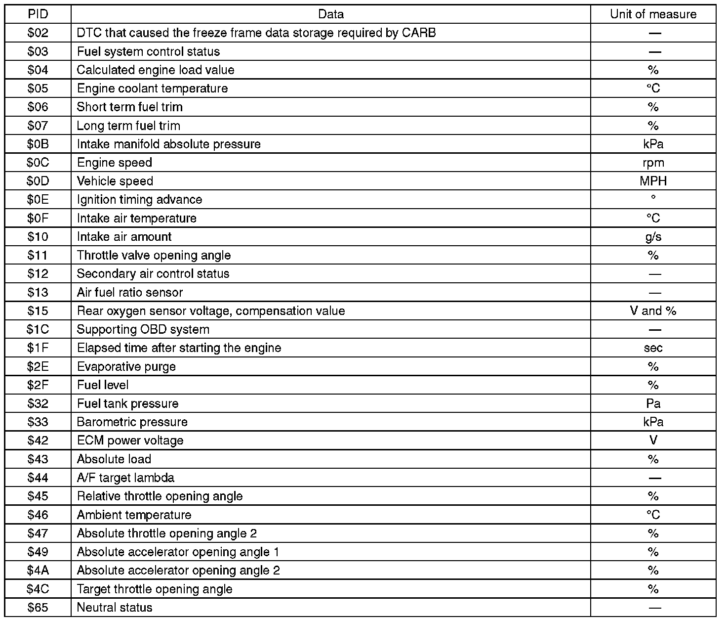A list of the support data and PID (Parameter Identification) codes are shown in the following table.