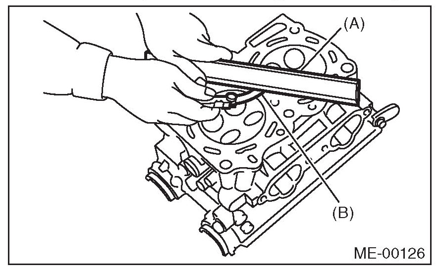 Measure the warping of the cylinder head surface that mates with cylinder block using a straight edge (A) and thickness gauge (B).