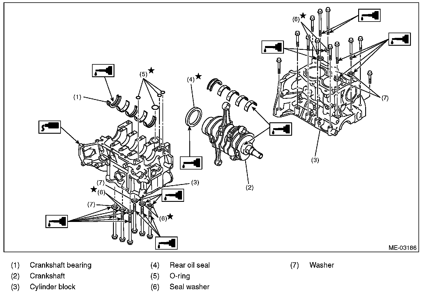 1) Remove oil on the mating surface of cylinder block before installation. Apply a coat of engine oil to the bearing and crankshaft journal.