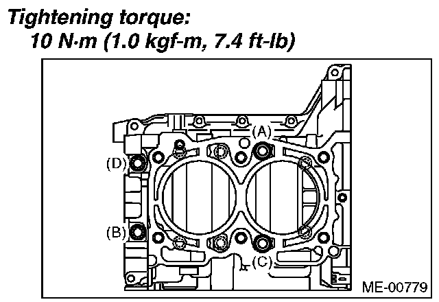 7) Tighten the LH side cylinder block connecting bolts (A - D) further in alphabetical order.