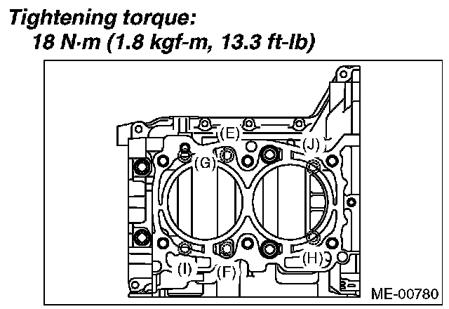 6) Tighten the 10 mm cylinder block connecting bolts on RH side (E - J) in alphabetical sequence.