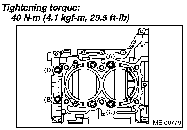 9) Tighten the LH side cylinder block connecting bolts (A - D) further in alphabetical order.