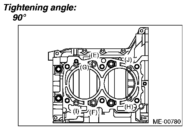 10) Tighten the RH side cylinder block connecting bolts (E - J) further in alphabetical order.