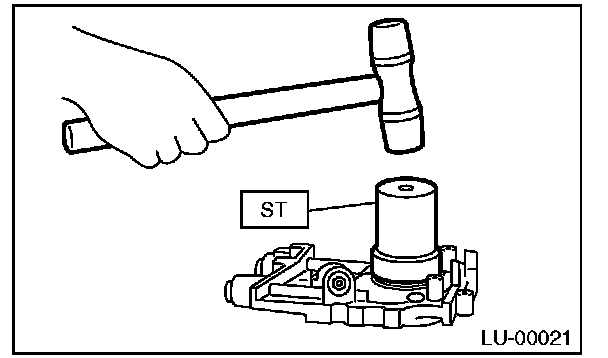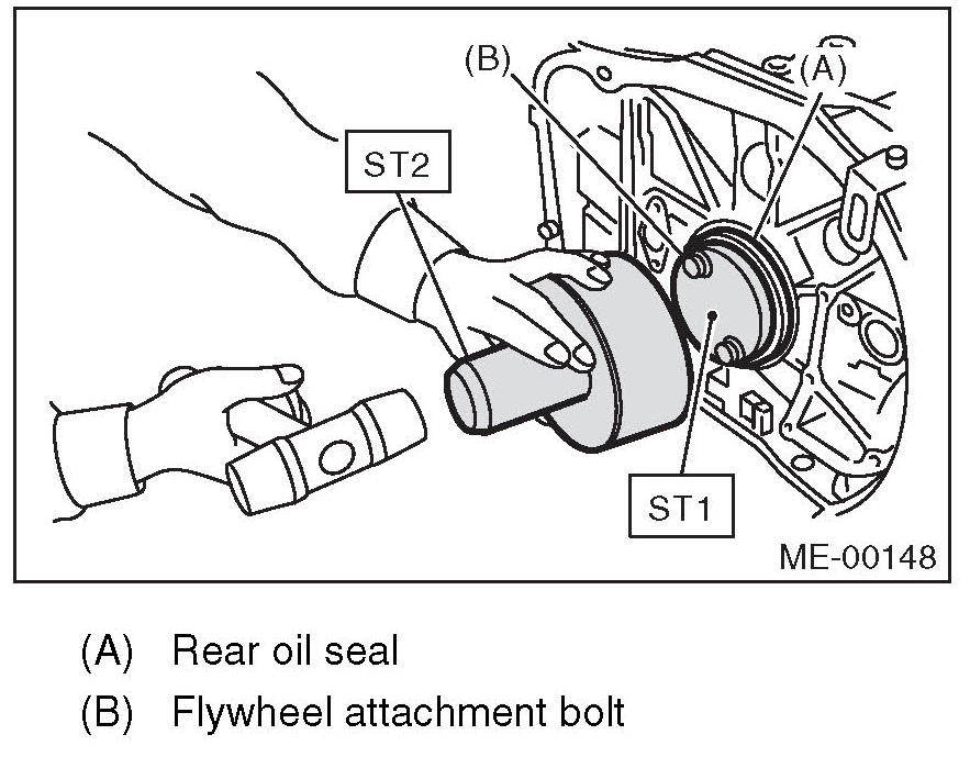 12) Apply a coat of engine oil to the oil seal periphery and install the rear oil seal using ST1 and ST2.