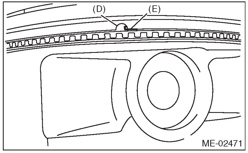 16) Align the upper rail spin stopper (E) to the side hole (D) on the piston.