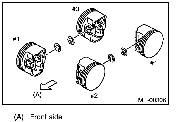 7) Set the parts so that the #3 and #4 cylinders are on the upper side. Following the same procedures as used for #1 and #2 cylinders, install the pistons and piston pins.