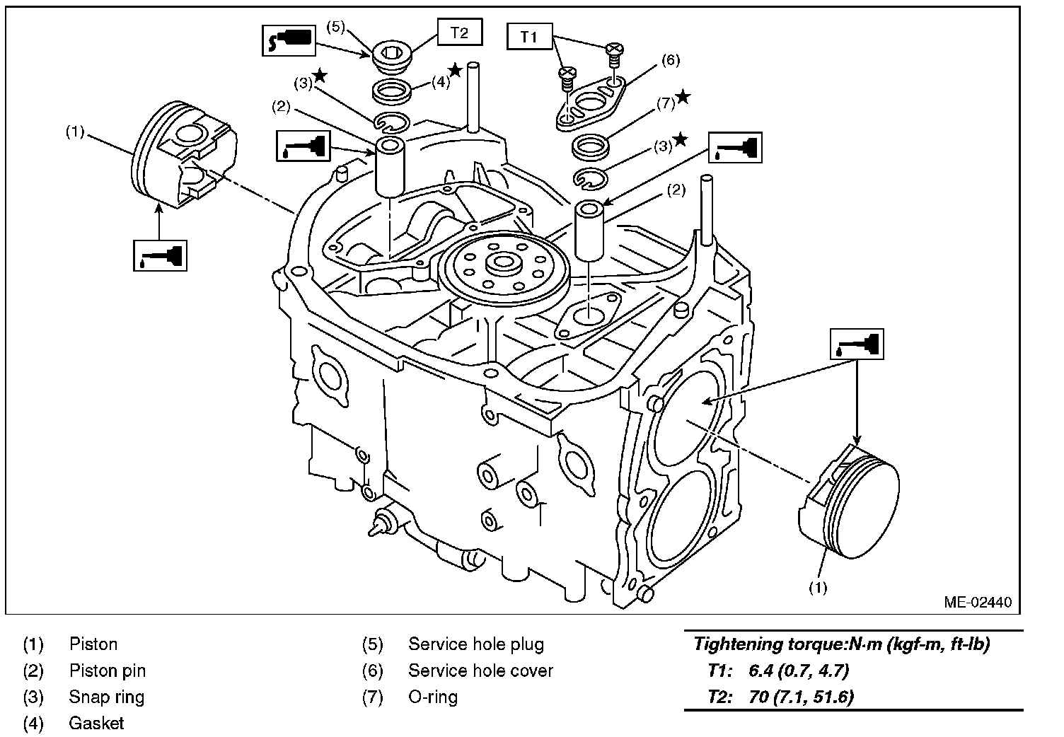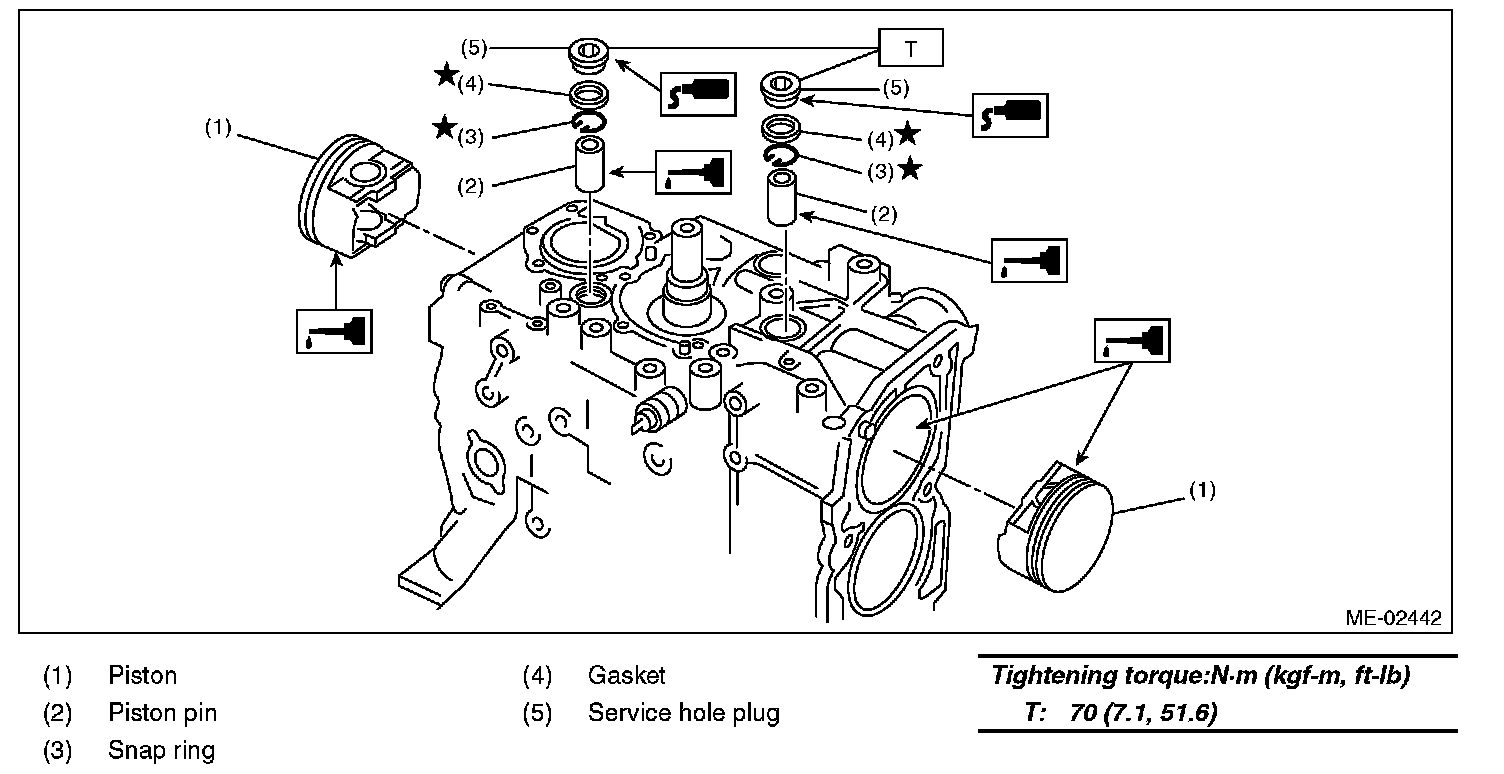 3) Apply a thin coat of engine oil to piston pin, and insert the piston pin into piston and connecting rod through service hole.