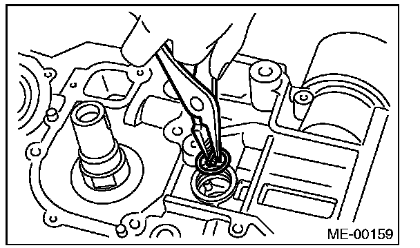 19) Install the snap ring. Before positioning the piston on the cylinder block, attach the snap ring in the service hole of the cylinder block and the piston hole on the opposite side.