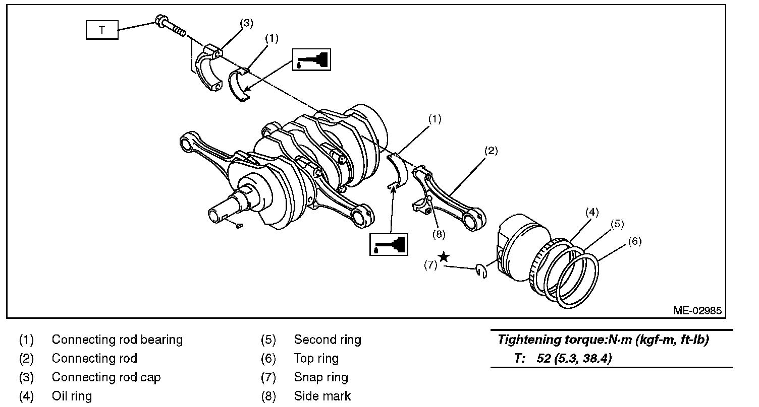 3) Attach the connecting rod cap, and tighten with the connecting rod bolt. Make sure the arrow on connecting rod cap faces the front during installation.