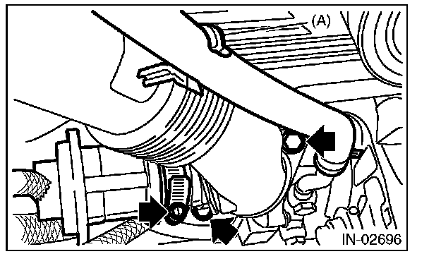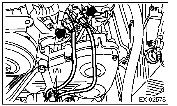 1) Disconnect the connectors from front oxygen (A/F) sensor and rear oxygen sensor, and remove the clip (A) securing the front oxygen (A/F) sensor harness and rear oxygen sensor harness.
