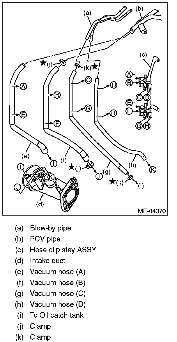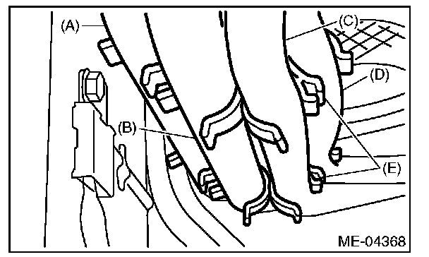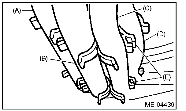 3) Remove the vacuum hose (A), vacuum hose (B), vacuum hose (C) and vacuum hose (D) from the clip (E).