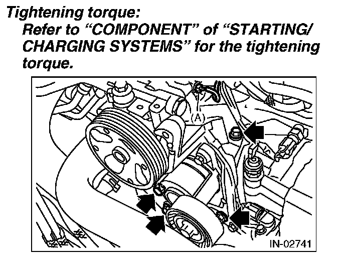 6) Disconnect the connector (A) from power steering pump, and remove the power steering pump together with the power steering pump bracket from engine and rod stopper.