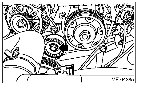 3) Remove the bolt securing the idler pulley to the A/C compressor bracket, and remove the idler pulley.