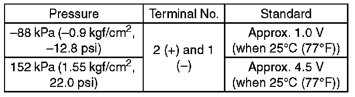 NOTE: When vacuum occurs at the pressure port of manifold absolute pressure sensor, the voltage will drop from the value as in step 3). When positive pressure occurs, on the other hand, the voltage will rise.