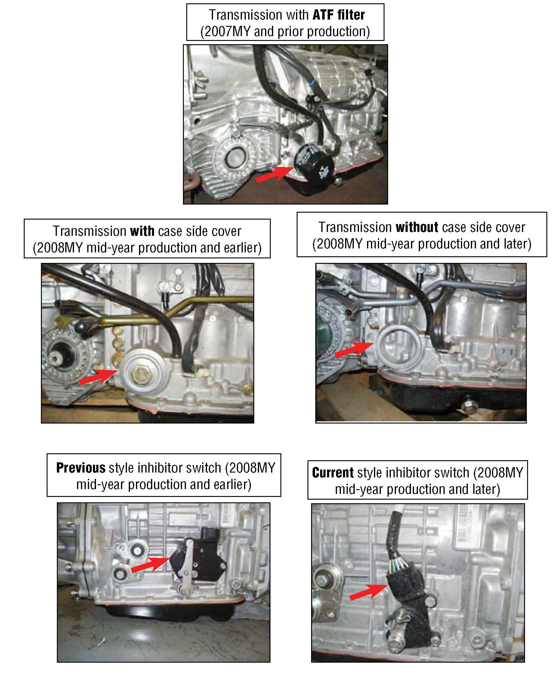 During 2008 mid-year production the transmission was once again modified, the design of the inhibitor switch and the case side cover was deleted. A visual inspection will help you identify which style transmission is in the vehicle.