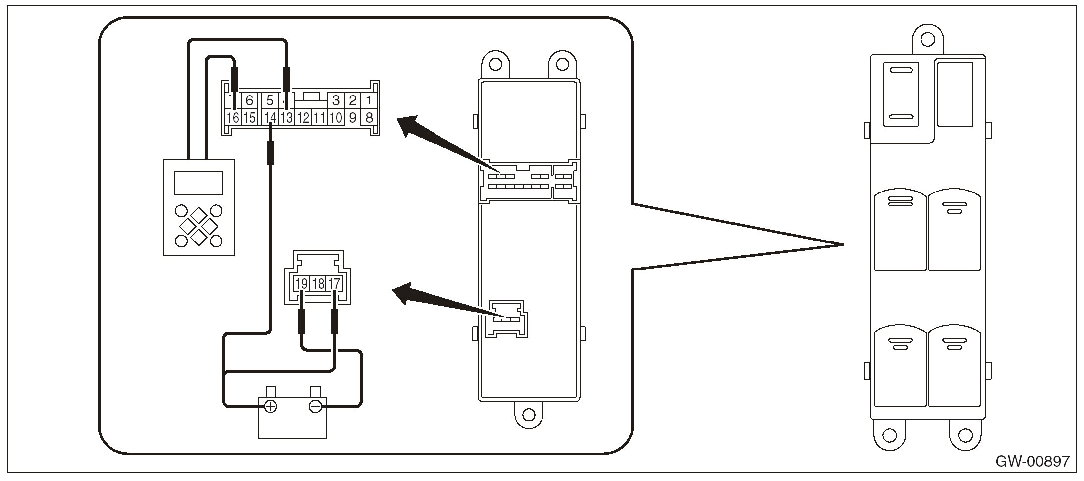 2. Connect the battery and the Subaru Select Monitor to the power window main switch terminal.