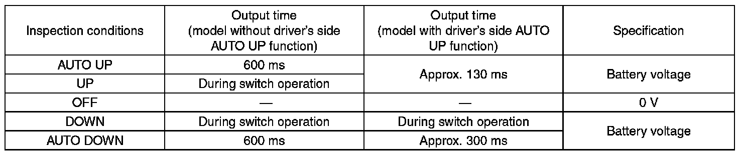 NOTE: Since output time during window UP operation is extremely short, it cannot be checked without using a measuring instrument such as oscilloscope. Output is constantly produced while the switch is operated for window DOWN operation.
