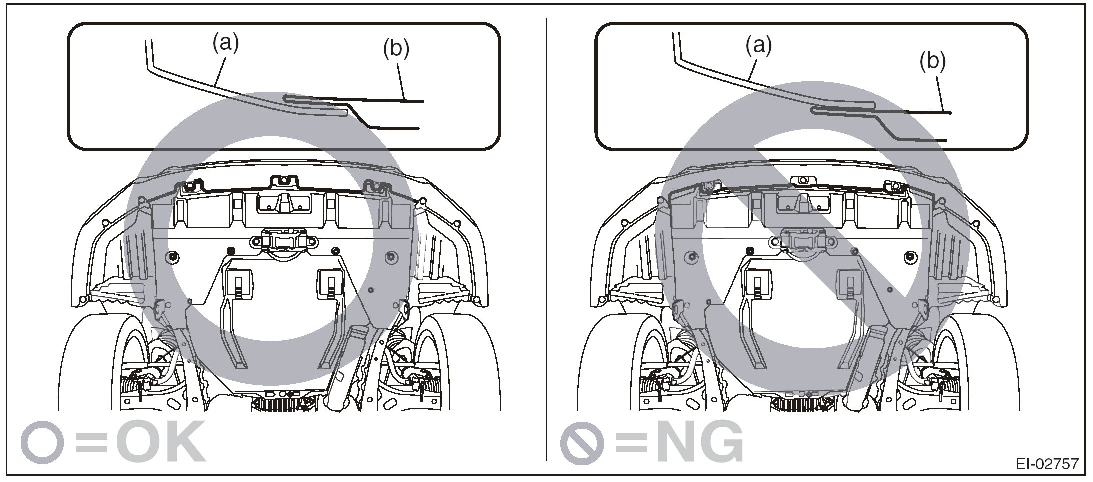CAUTION: Install the under cover so that the under cover front end (b) comes inside of the front bumper face (a).