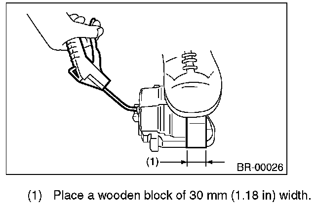 2) Place a wooden block in the caliper body as shown in the figure to prevent the piston from jumping out and being damaged.
