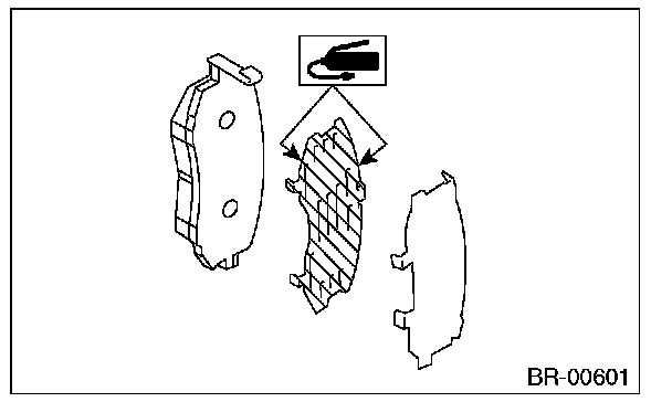 2) Apply a thin coat of Molykote AS880N (Part No. K0777YA010) or grease contained in the pad kit to both surfaces of the pad and inner shim.