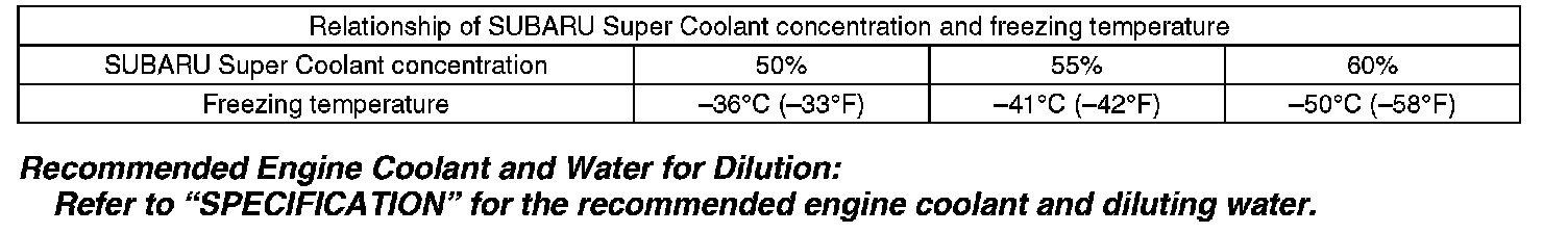 SUBARU Super Coolant concentration must be used from 50 to 60% to assure the best performance of the anti-freeze and anti-rust agents.