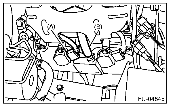 11. Disconnect the water hose (A) and EGR pipe (B) from the LH side of multi-function duct assembly.