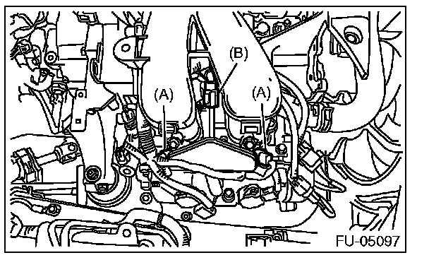 19. Remove the bolts (B) on the LH side which secure the multi-function duct assembly to intake manifold.