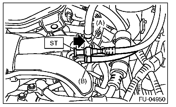 1. Attach ST to the fuel delivery pipe and push ST in the direction of arrow mark to disconnect the quick connector of the fuel delivery hose (A).