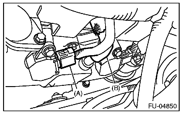 14. Disconnect the connectors from front oxygen (A/F) sensor (A) and rear oxygen sensor (B).