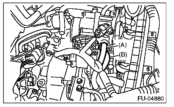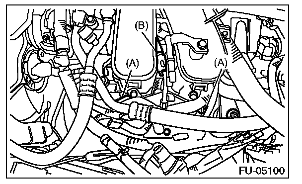 12. Disconnect the PCV hose (A) and water hose (B) from the RH side of multi-function duct assembly.