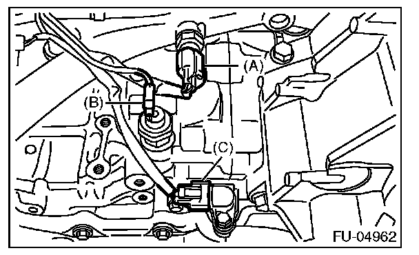 13. Disconnect the connectors from the engine coolant temperature sensor (A), oil pressure switch (B) and crankshaft position sensor (C).