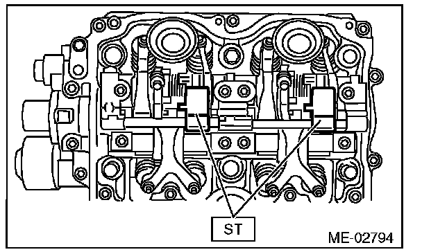 ^ Set the ST in the position shown in the drawing to mount the intake valve rocker assembly.