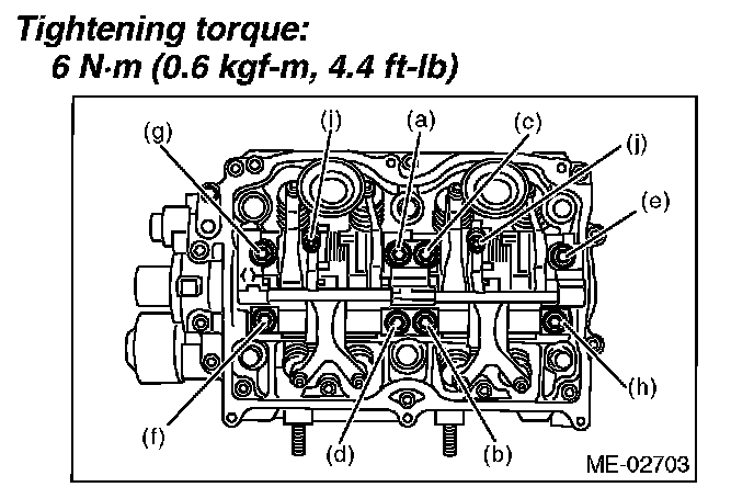 Leave two or three threads of bolts (i) and (j) engaged in order to retain the valve rocker assembly.