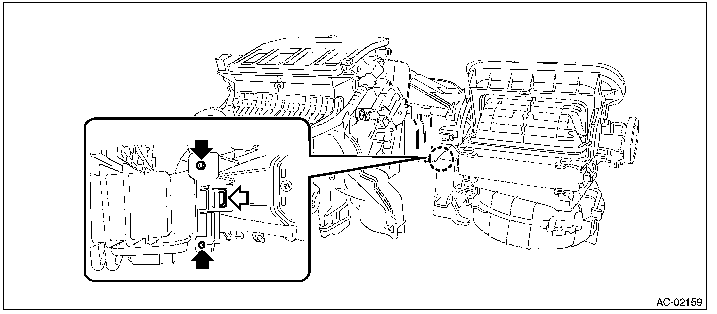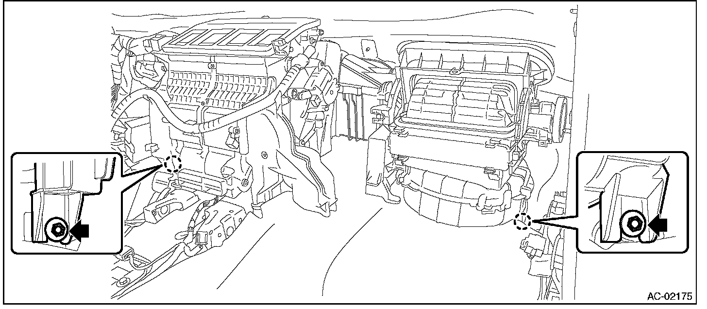 4. Remove the connector and bolts, and remove the expansion valve and AC pipes from the evaporator.