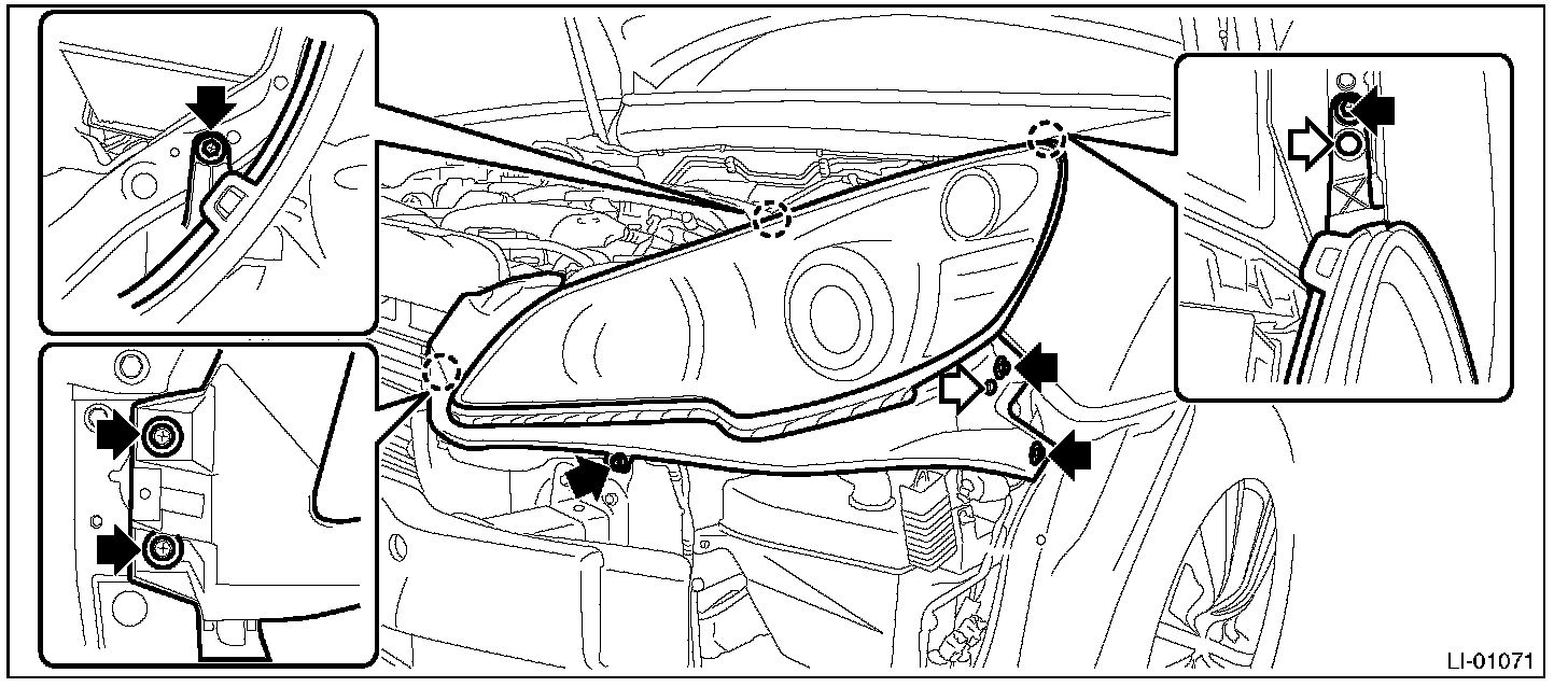 2. Remove the clips and remove the air intake duct. (When removing the headlight RH).