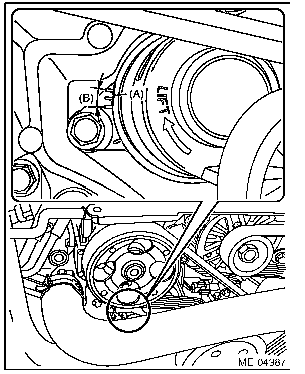 4) Check that the V-belt tension indicator (A) is within the limit (B).
