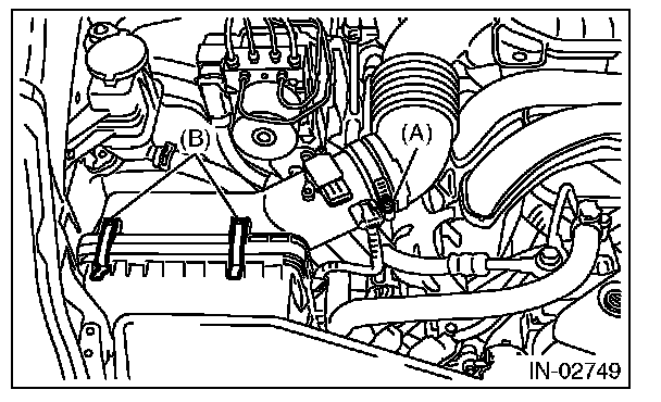 4. Disconnect the connector (A) from the mass air flow and intake air temperature sensor, and remove the clip (B).