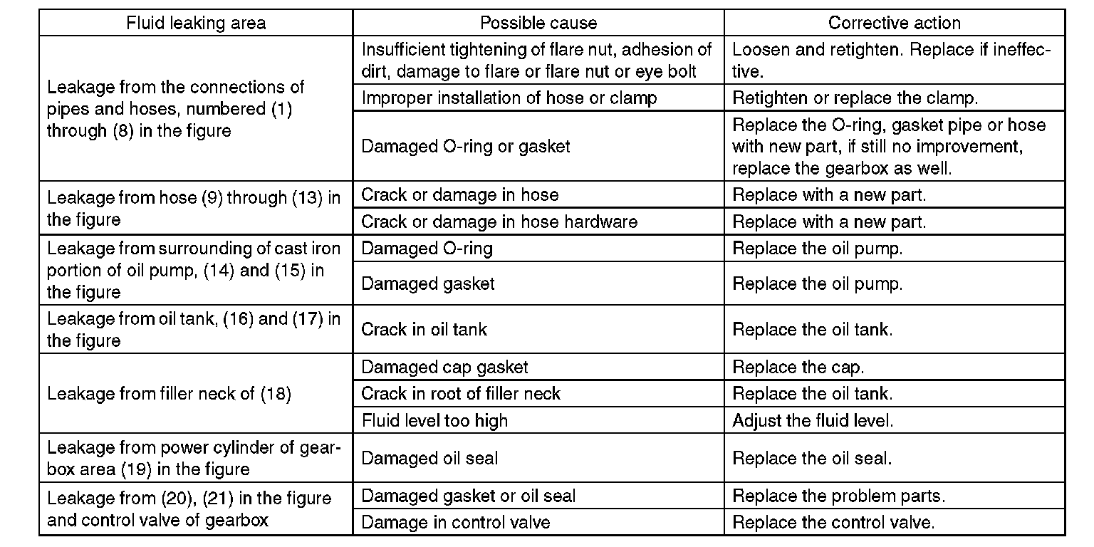 There are conditions in which a fluid leak is diagnosed, but is not actually leaking. This is because the fluid spilt during the last maintenance was not completely wiped off. Be sure to wipe off spilt fluid thoroughly after maintenance.