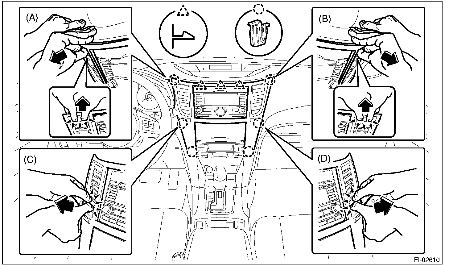 3. Insert a finger into the air vent grille and release the left and right clips at the center of the center panel. (C), (D)