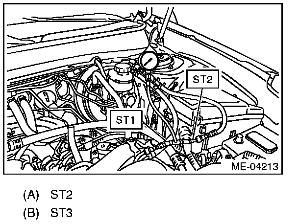 2) Connect the fuel pressure gauge with ST2 and ST3.