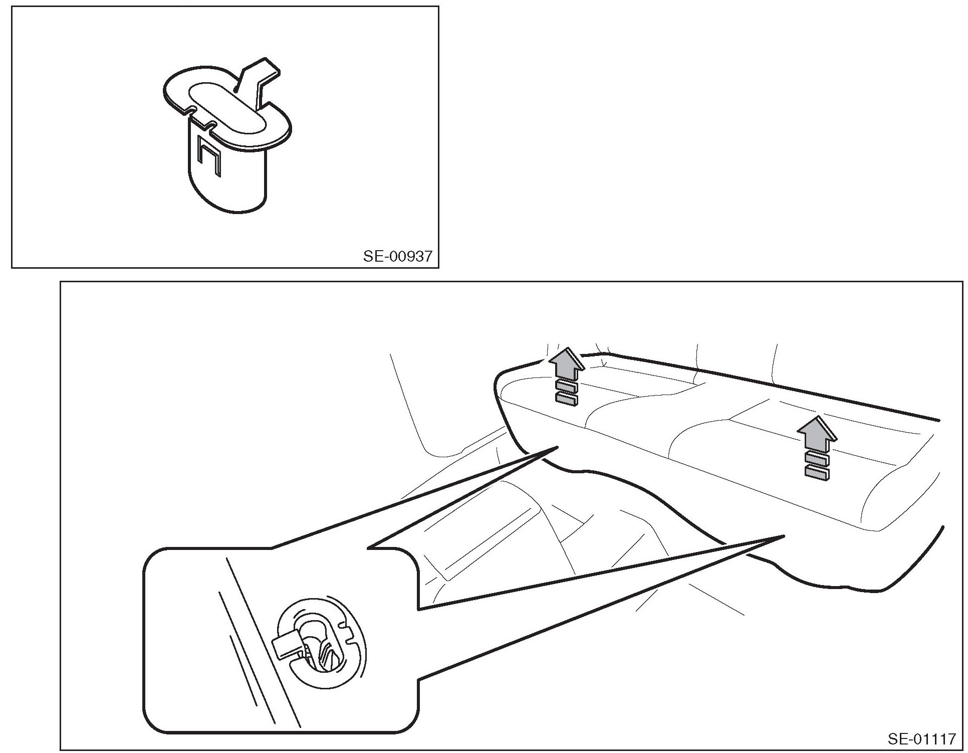 CAUTION: If the hook is removed from vehicle body, replace the hook with the new part to avoid the deterioration of seat securing.