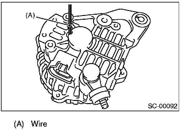 Before assembling the front and rear parts, press the brush down into the brush holder, then fix the brush in that position by inserting a [1 mm (0.08 in) dia., 40 - 50 mm (1.6 - 2.0 in) long] wire through the hole as shown in the figure.