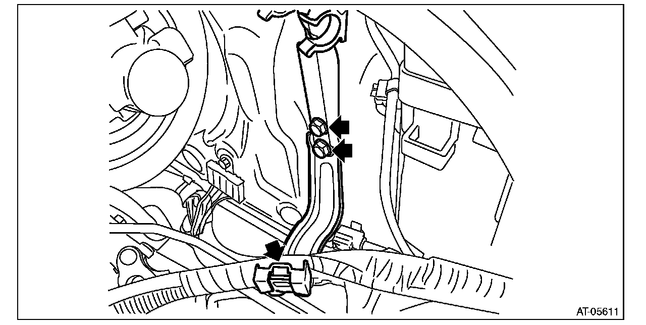 15) Remove the front sub sensor harness connector and front harness clip from the vehicle, and route them under the CVTF cooler pipe assembly. (OUTBACK model)